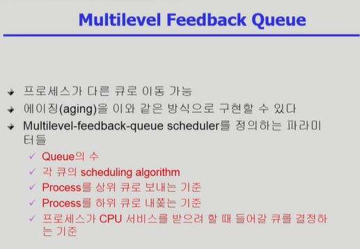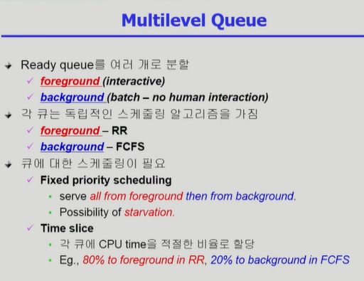 - 큐를 나누고, CPU는 어느 큐를 먼저 고를지, 그리고 그 큐에서 어떤 프로세스를 먼저 고를지 스케줄링