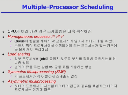 - Global scheduling: kernel level thread는 일반 프로세스와 마찬가지로 커널의 단기 스케줄러가 thread 결정