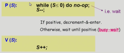- 이 연산에서 S 변수는 S가 양수면 기다리는 프로세스가 없다는 것, 음수면 기다리고 있다는 의미 (위에서와 다름)