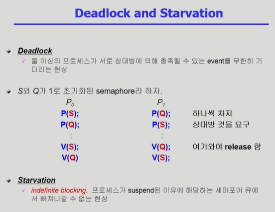 - P0가 P(S)를 수행하고 CPU를 P1에 넘겨주면 서로 영원히 기다리게 된다 -> 자원 얻는 순서를 정해서 해결