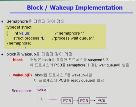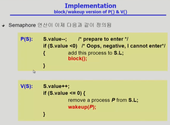 - critical section을 수행중인 다른 프로세스를 CPU ready queue가 아닌 semaphore에 대한 wait queue에서 대기
