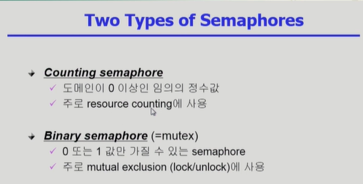 - critical section의 길이가 매우 짧은 경우 block/wakeup 오버헤드가 busy-wait 오버헤드보다 더 커질 수 있음