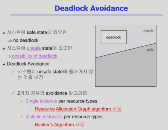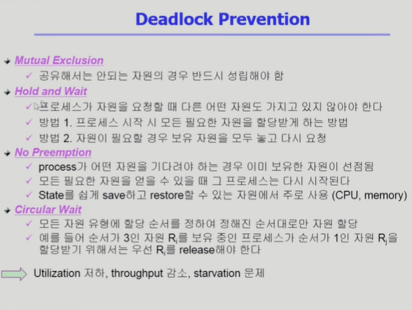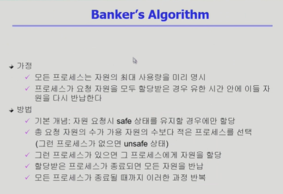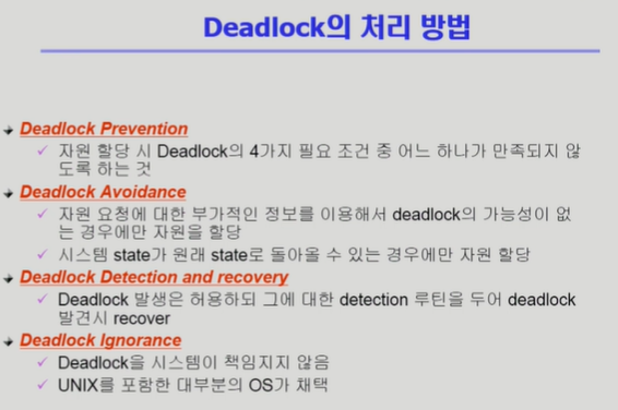 - 현대에는 대부분 OS가 deadlock을 책임지지 않고 사용자에게 맡긴다