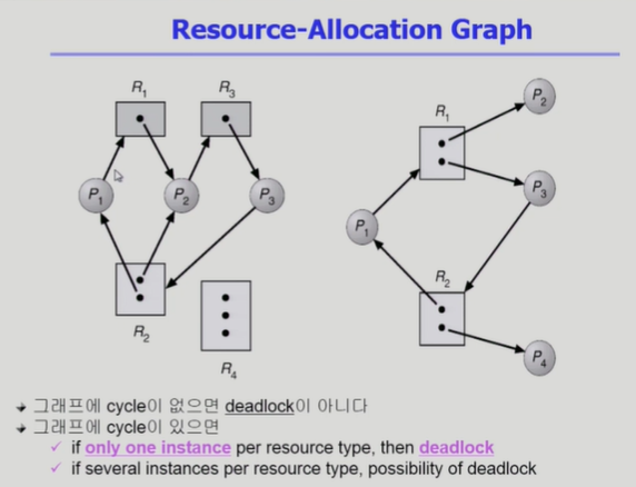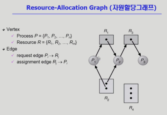 - assignment edge: 해당 자원이 가리킨 프로세서에 할당되어 있다는 의미