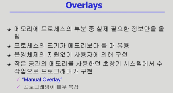 - 예전에 한 프로세스조차도 전체적으로 메모리에 올라갈 수 없었을 때 사용
