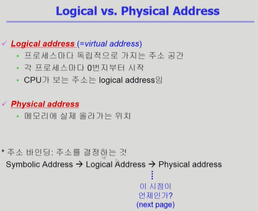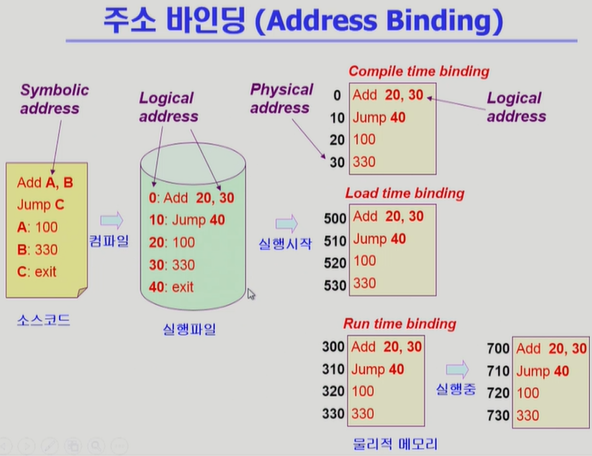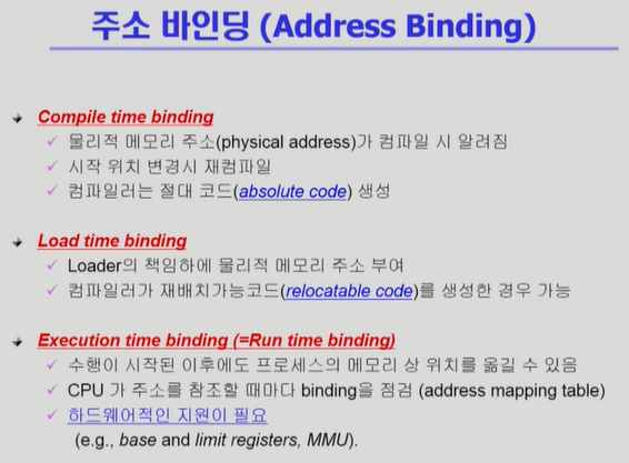 - 물리 메모리의 어떤 주소에 올라갈지 결정하는 주소 바인딩 과정이 필요하다