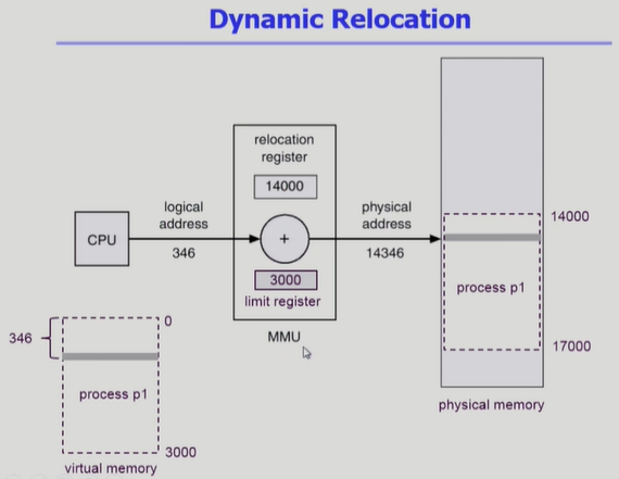 - relocation register(base register): 물리 메모리 주소의 시작지점 저장 -> 요청받은 논리 주소에 이 값을 더해 변환