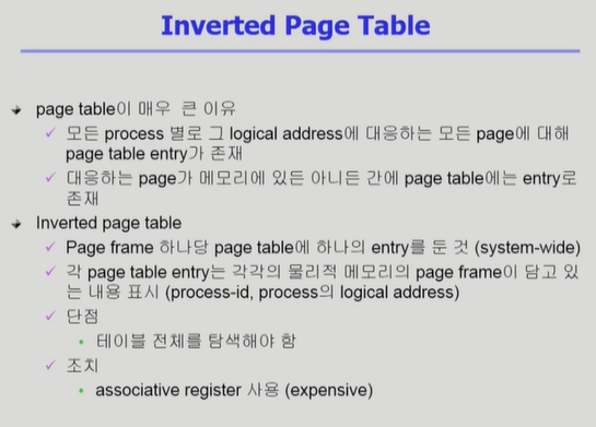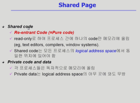 - 예: 동일한 워드 프로그램 3개 실행 중일 때, 코드 부분은 동일할 것이므로 물리 메모리에 한번만 올려놓는다 (공유)