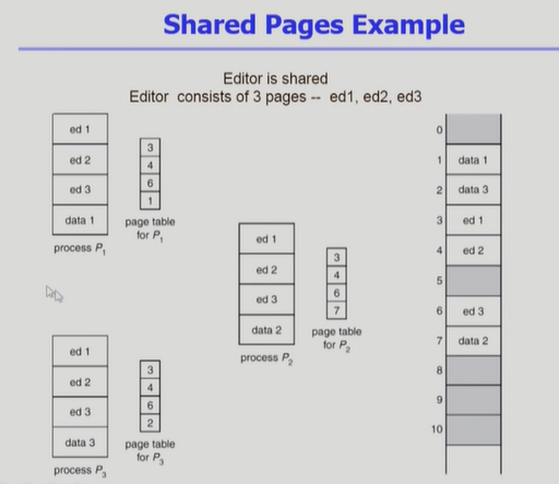- 예: 동일한 워드 프로그램 3개 실행 중일 때, 코드 부분은 동일할 것이므로 물리 메모리에 한번만 올려놓는다 (공유)