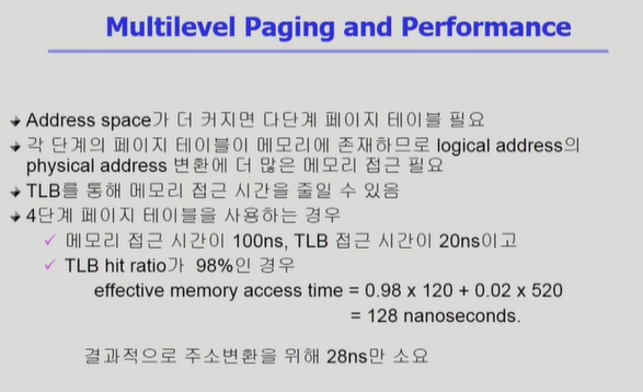 - 다단계 페이지 테이블을 사용해도 TLB 사용 비율이 높다면 오버헤드가 그렇게 크지 않다